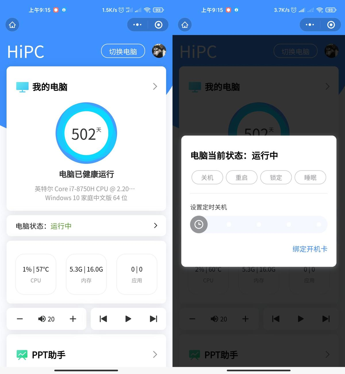系统监测:可以看到 PC 的 CPU 和内存占用情况。