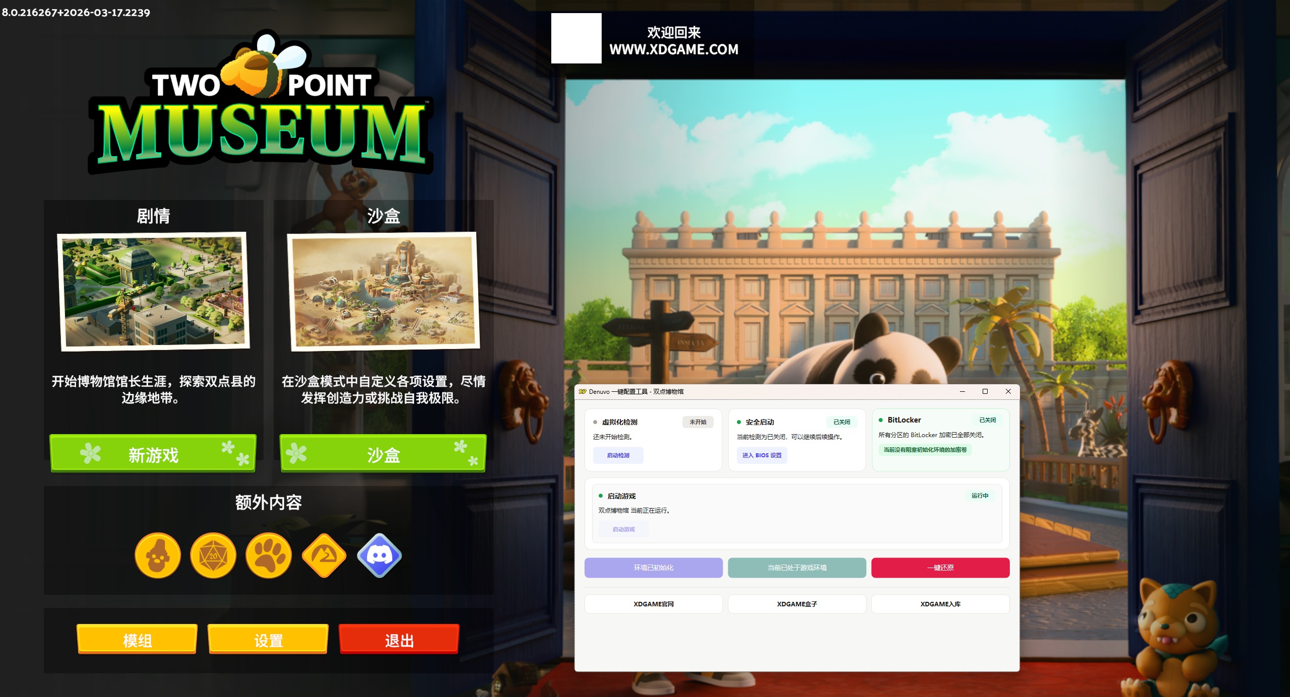 从蓝图的一笔一画到馆藏的悉心运营,亲手打造一座令世人惊叹的博物馆!穿越历史的尘埃,探寻震惊世界的古老文物;自由规划展厅布局,不断丰富馆藏内容。为员工营造舒适的工作环境,为访客提供难忘的参观体验——当然,也别忘了让孩子们离那些珍贵的展品远一点。 虚拟工具现已进入成熟阶段(想体验的可以试试了)虚拟机只是用来绕D密,所以玩起来和正常版基本没差,几乎没有性能损耗。 没动手能力嫌麻烦不建议搞(其实也没想象那么麻烦),不过你真的能搞懂,D加密游戏有相关补丁全都是可以玩的。 Q1:会不会搞坏电脑 A:不保证所有人硬件都兼容都能玩,考虑清楚在下!部分人存在一定蓝屏/死机/损坏系统风险!玩不了就删不提供任何折腾帮助! Q2:游戏会不会很卡,容易闪退 A:虚拟机仅用来绕D密,几乎不占用性能。这些大作要求配置较高,有些优化也一般,(能玩情况下)如果闪退,你玩正版极大概率也会闪退 Q3:有些游戏个别CPU玩不了吗? A:最近更新的游戏补丁,大部分都能玩,之前游戏的补丁作者也一直不断更新迭代中,这是虚拟机正在迈向成熟阶段,但不保证所有人硬件都能玩考虑清楚在下。 打开游戏之前的环境准备(所有人都必须做 只需要做一次 后续畅玩所有D加密游戏) 进入主板bios设置 1. 开启虚拟化: 找到 SVM Mode (AMD) 或 Intel Virtualization Technology (Intel),设置为 Enabled。 2.关闭安全启动: 找到 Secure Boot,设置为 Disabled。 注:每个主板具体设置不同 不知道设置可以百度查询或问豆包自己主板型号的相关设置 以上都完成后:打开Denuvo.exe 检查第一排设置是否都已经完成 都显示小绿点代表以上步骤完成 都显示小绿点代表完成,我们点击软件的初始化,然后重启电脑【开机时点F7 或 手动选择禁用驱动程序强制签名】 重启电脑后继续打开Denuvo.exe点击 启动游戏 → 开始玩耍 ↓ 站长亲测截图 ↓ v8.0(Build.22389256)|容量5.11GB|官方简体中文|支持键盘.鼠标.手柄游戏介绍