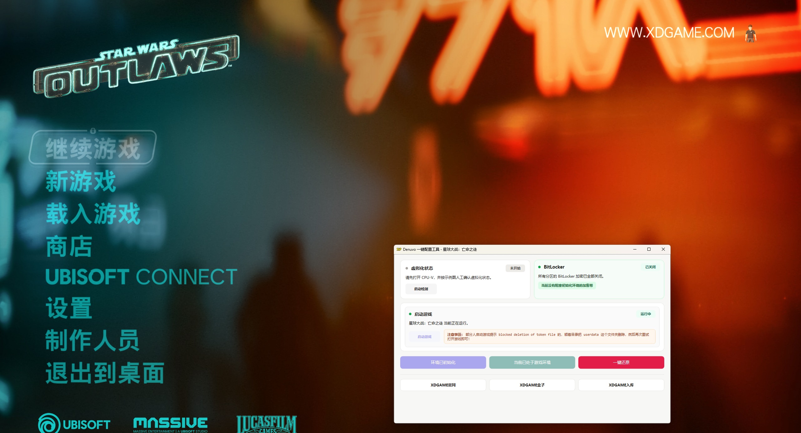 在首个《星球大战》开放世界游戏中,你将扮演恶棍凯·维丝,为追寻自由与新生赌上一切。游历银河系名胜,探索未知领域,加入头号通缉犯的行列,通过战斗、偷窃并与犯罪集团斗智斗勇,在充满机遇与风险的银河中书写自己的传奇——只要你不惧冒险。 虚拟工具现已进入VBS1.5成熟阶段(想体验的可以试试了)虚拟机只是用来绕D密,所以玩起来和正常版基本没差,几乎没有性能损耗。 没动手能力嫌麻烦不建议搞(其实也没想象那么麻烦),不过你真的能搞懂,D加密游戏有相关补丁全都是可以玩的。 Q1:会不会搞坏电脑 A:不保证所有人硬件都兼容都能玩,考虑清楚在下!部分人存在一定蓝屏/死机/损坏系统风险!玩不了就删不提供任何折腾帮助! Q2:游戏会不会很卡,容易闪退 A:虚拟机仅用来绕D密,几乎不占用性能。这些大作要求配置较高,有些优化也一般,(能玩情况下)如果闪退,你玩正版极大概率也会闪退 Q3:有些游戏个别CPU玩不了吗? A:最近更新的游戏补丁,大部分都能玩,之前游戏的补丁作者也一直不断更新迭代中,这是虚拟机正在迈向成熟阶段,但不保证所有人硬件都能玩考虑清楚在下。 打开游戏之前的环境准备(所有人都必须做 只需要做一次 后续畅玩所有D加密游戏) 进入主板bios设置【先在电脑任务管理器→性能→CPU→右下角看看虚拟化是否已开启 开了就无需在进bios开启】 开启虚拟化: 找到 SVM Mode (AMD) 或 Intel Virtualization Technology (Intel),设置为 Enabled。 注:每个主板具体设置不同 不知道设置可以百度查询或问豆包自己主板型号的相关设置 虚拟化开好后:打开Denuvo.exe 点击软件的初始化,然后重启电脑【开机时点F7 或 手动选择禁用驱动程序强制签名】 重启电脑后继续打开Denuvo.exe点击 启动游戏 → 开始玩耍 注意事项:部分人启动游戏提示blocked deletion of token file的,顺着目录把userdata这个文件夹删除然后再次重试打开游戏即可! 站长亲测截图 v1.7(Build.Build.18870567)|容量71.5GB|官方简体中文|支持键盘.鼠标.手柄游戏介绍