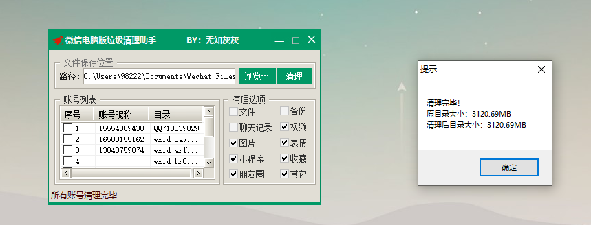 本文是一款PC端的微信电脑版垃圾清理助手,由易语言编程一般会报毒;自动时自动读取保存位置,同时会释放一个pb.dll用来解析账号文件,便于读取微信昵称;左边勾选要清理的微信号,右边勾选要清理的内容,点击清理即可;软件自动保存路径,不用每次打开重复选择路径,个别用户电脑无法读取微信缓存目录。